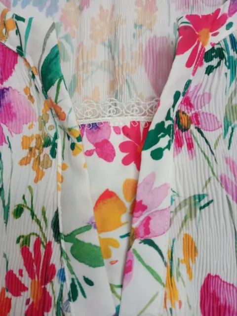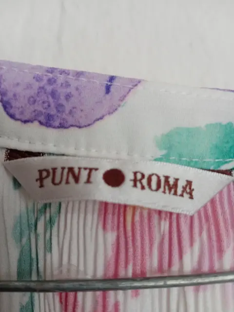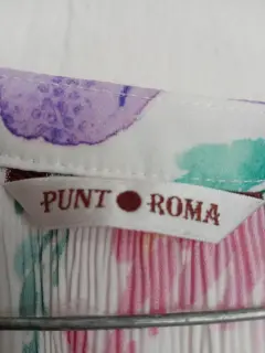 Blusa floreada punto Roma Talla M. Hermosa blusa de colores fiusha, morado,verde, rosas. Con flores. Marca Punto Roma. Talla M. Amplia. Mide de hombros 40cm. Largo 63cm y de sisa 52cm. Tela es corrugada . Con un lindo olán abajo. Cuello V con lindo encaje . Al igual que las mandas 3/4 con lindo olán y encaje al final. Buen estado usada pocas veces. Linda caída .se lava en casa. Es fresca y viste muy bien.