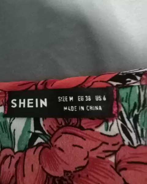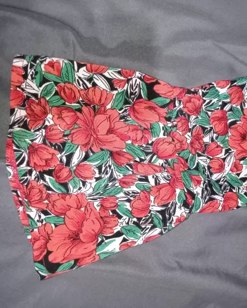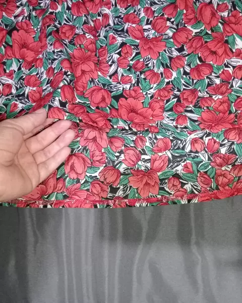 Bonita y coqueta blusa, con flores rojas. Su tela es fresca y ligera, es asimétrica en la parte de atrás (cola de pato), tiene costura en la parte del busto (queda suelta en de la cintura) y detalle de mangas de campana