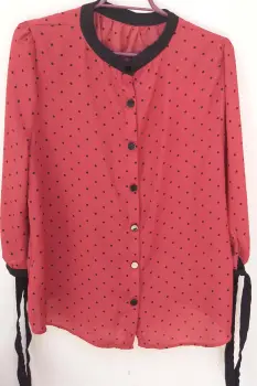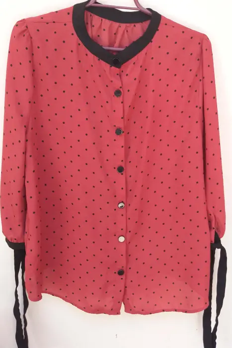 Blusa camisera sin cuello formal, rosa con punto negros, con listones en las mangas 3/4 y botones al frente. 104 cm pecho, 56 cm largo. Marca E-MTodas las compras incluyen obsequioAcepto ofertasEnvío a la brevedad