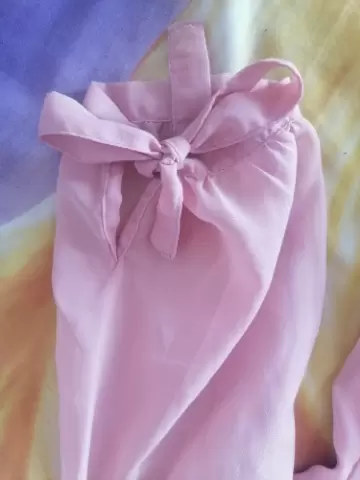 Blusa formal, sus mangas son 3/4 y se hacen moñitos en ellas.La parte de abajo termina en resorte.Ojo: es rosa pastel. El tono es igual en vivo que n la foto donde la traen puesta.