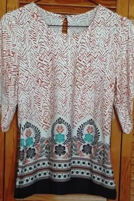 Blusa 100% poliester.Muy colorida y fresca.Cuello redondo con un botón en la parte de atrás.Manga mariposa.
