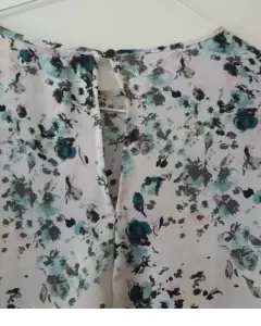 Es una blusa de tela fresca de manga 3/4 color blanca con estampado de flores. En la parte de atras tiene un boton y una pequeña abertura. Enfrente tiene una parte asimetricaEs talla M pero a mi parecer las mangas vienen un poco reducidasNo tiene detallesMedidas:Axila a axila: 46 cmHombros : 35 cmLargo: 42 cmManga del ancho del brazo : 14 cm