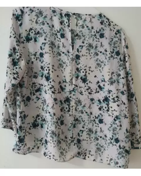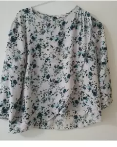 Blusa fresca floral. Es una blusa de tela fresca de manga 3/4 color blanca con estampado de flores. En la parte de atras tiene un boton y una pequeña abertura. Enfrente tiene una parte asimetricaEs talla M pero a mi parecer las mangas vienen un poco reducidasNo tiene detallesMedidas:Axila a axila: 46 cmHombros : 35 cmLargo: 42 cmManga del ancho del brazo : 14 cm