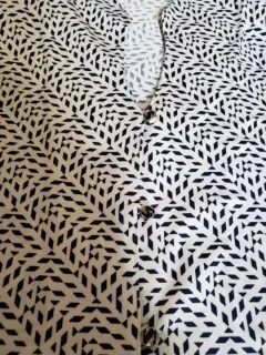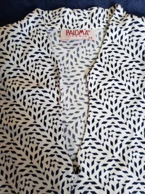 Un solo uso, talla 32, poliester, ideal para calores, lycra stretch. Color blanco con tramas azul marino y detalle de botones. Mangas 3/4 con hombreras.