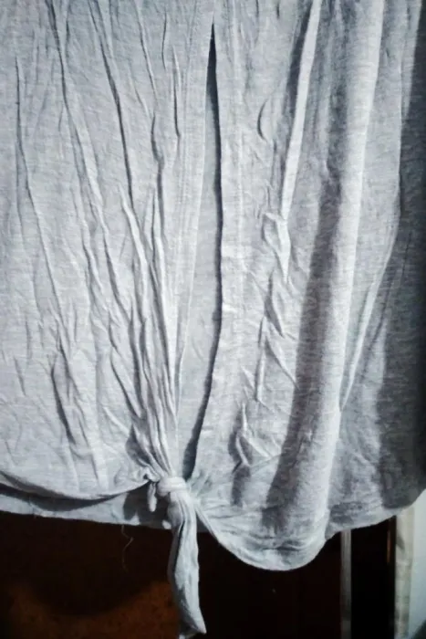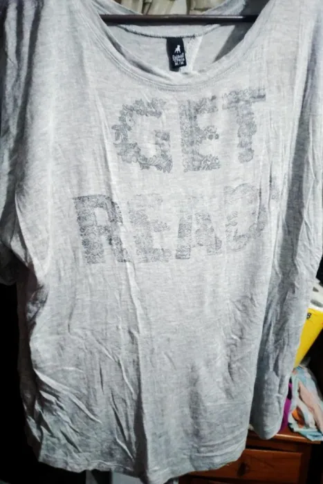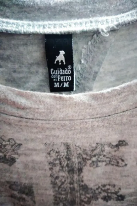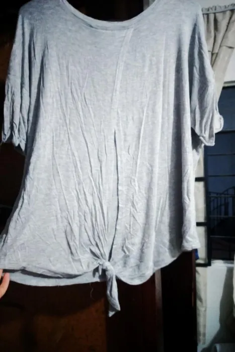 Excelente, fresca y juvenil, blusa gris con abertura en la espalda. Tiene una pequeña mancha rosa que se muestra en las fotos, el brazo la oculta bien, por este detalle es el costo, pero vale mucho la pena. Aprovecha la promo, en la compra de esta y otra prenda de costo igual o menor, te llevas los 2 en $280