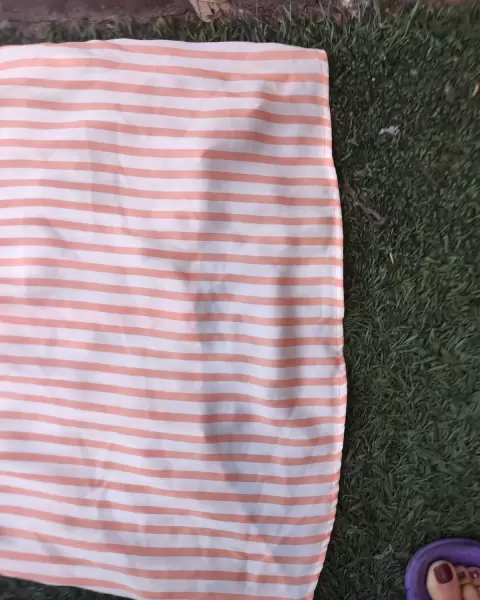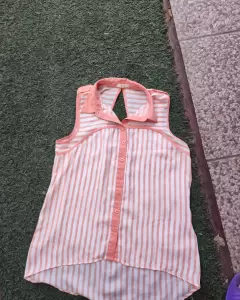 Blusa fresca colores naranja y blanco en rayas y en escote atrás en forma de rombo cuello sin mangas cola de pato se abotona por enfrente está nueva sin estiqueta talla mediana marca mine