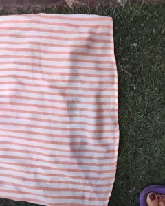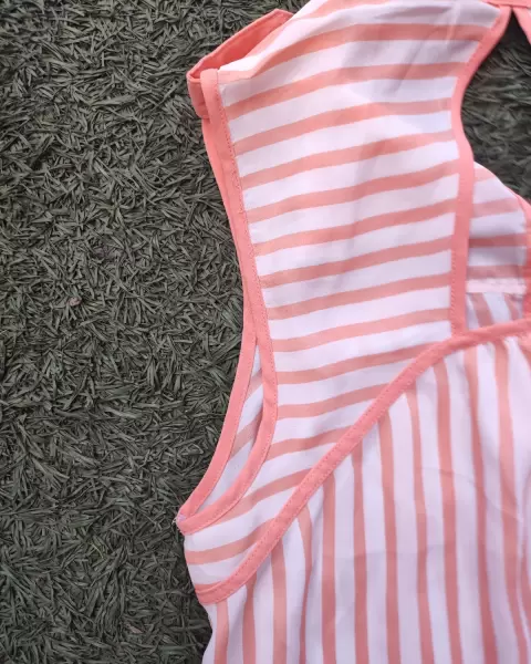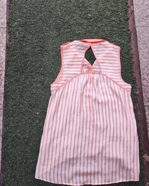 Blusa frescas de raya anaranjados y blancos. Blusa fresca colores naranja y blanco en rayas y en escote atrás en forma de rombo cuello sin mangas cola de pato se abotona por enfrente está nueva sin estiqueta talla mediana marca mine