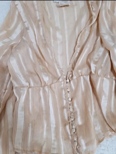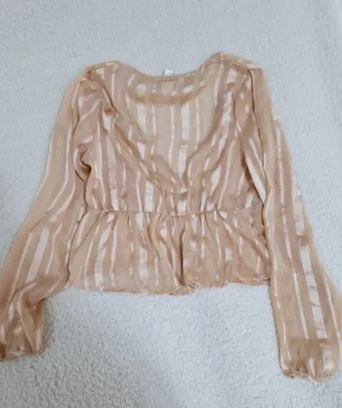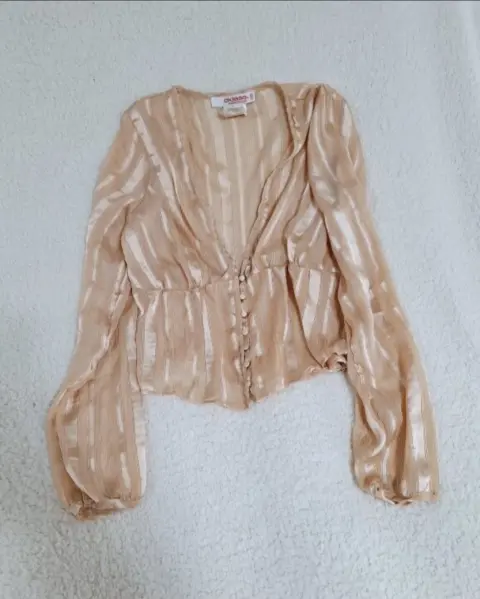BLUSA GASA MANGA LARGA STransparencia y con hilos brillosos en tono dorado secreto, botones delanteros forrados.Medidas:De axila a axila 45cmLargo 50cm