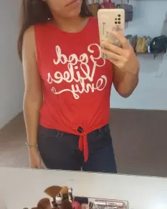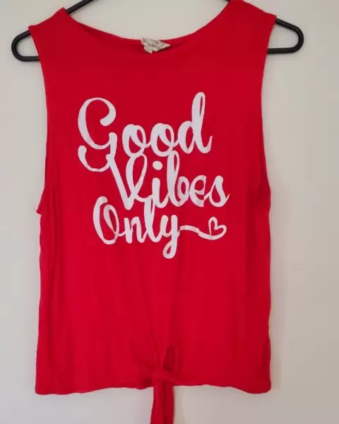 Moderna blusa sin mangas color rojo frase good vibes en excelente estado