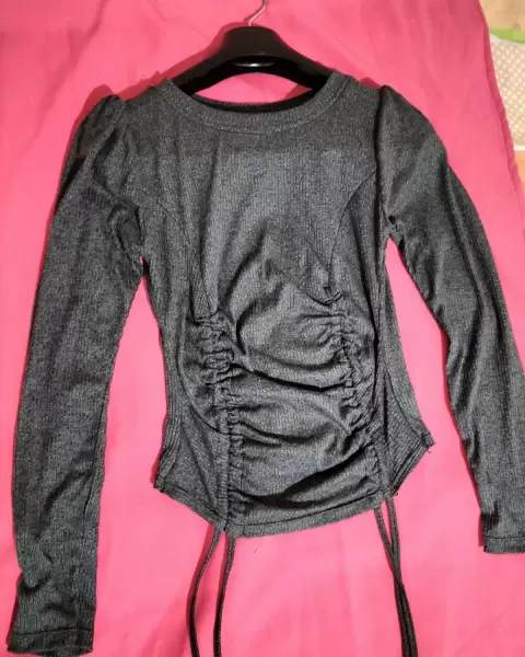 Blusa gris con ajuste. Excelente prenda para lucir tu figura, con jaretas ajustables para mejorar aún más tu figura, me gustó mucho, sólo que me quedo apretada
