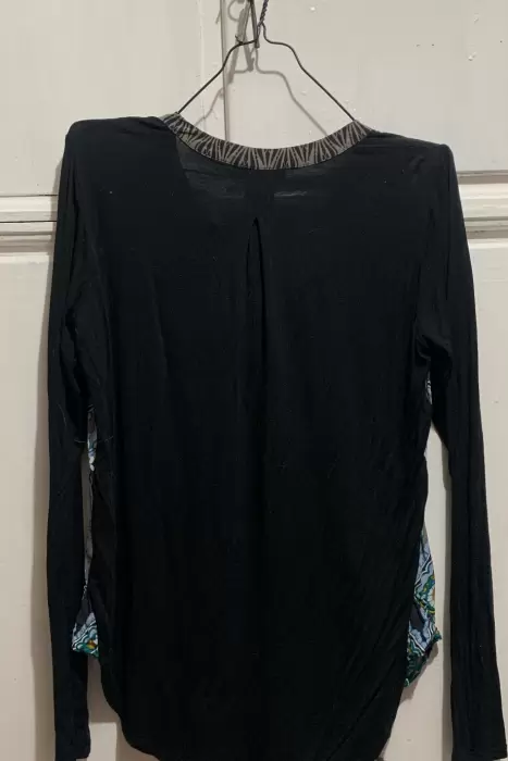 Blusa negra manga larga, 100% seda al frente es un poco strech 47 de axila a axila y de largo 42 de enfrente .. largo de atrás 47