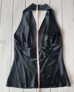 Talla: SHalter, media espalda descubierta, escote en V al frente, no trae cierre o botones. Medidas: 37 cm de axila, 28 cm de largo desde la etiqueta y desde el cuello 61 cm aproximadamente.