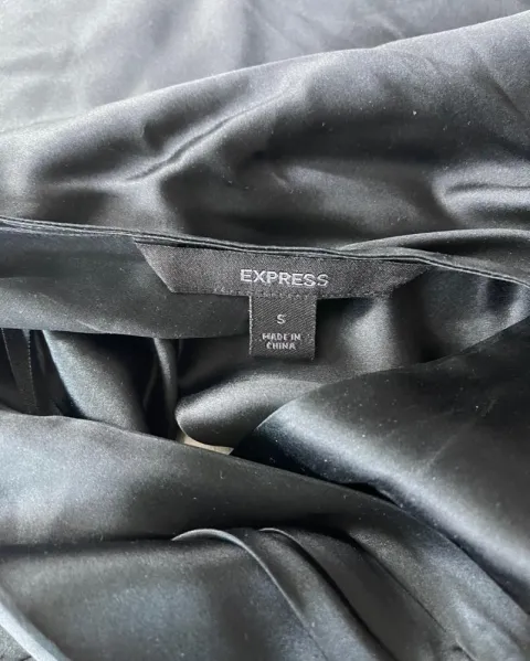 Blusa halter de seda negra Express. Talla: SHalter, media espalda descubierta, escote en V al frente, no trae cierre o botones. Medidas: 37 cm de axila, 28 cm de largo desde la etiqueta y desde el cuello 61 cm aproximadamente.