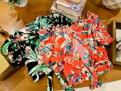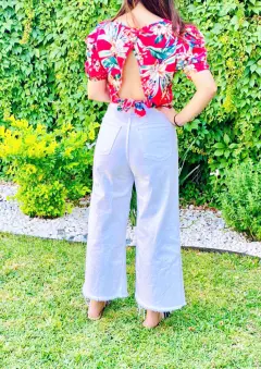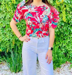 Blusa roja estampado tipo hawaiano, manga bombacha, escote en la espalda, se abrocha con moño atrás. Talla s/m