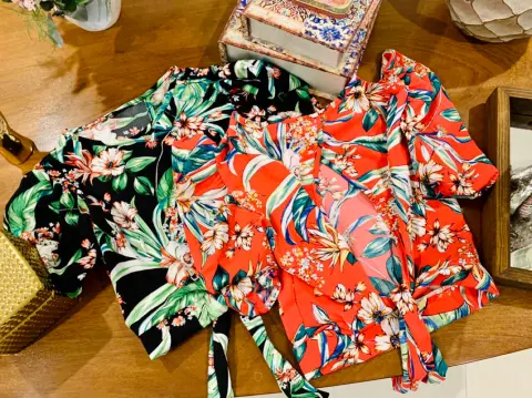 Blusa hawaiana 🌺. Blusa roja estampado tipo hawaiano, manga bombacha, escote en la espalda, se abrocha con moño atrás. Talla s/m