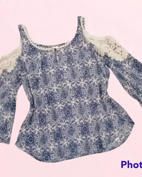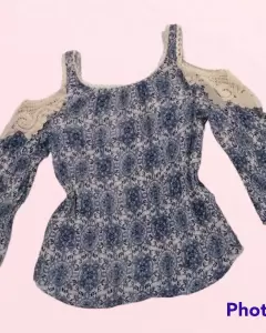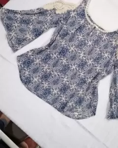 Blusa hermosa de tela fresca y diseño con aplique tejido.Mangas anchas . Ideal para pasear con jeans o shorts.Estira un poco la talla da una M