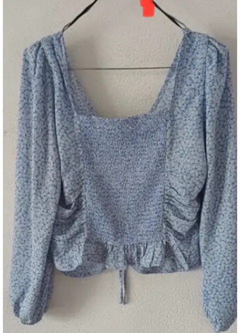 Blusa drapeada, llega ala cintura, tela fresca, mangas abombadas. Escote en V. Talla L. Solo la use 1 vez. Medidas: 50 cm axila a axila. Puede estirar un poco más, trae espalda con elástico. 60 cm de largo.