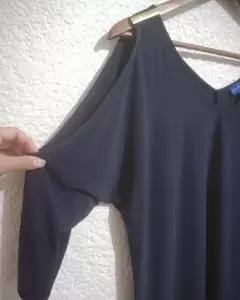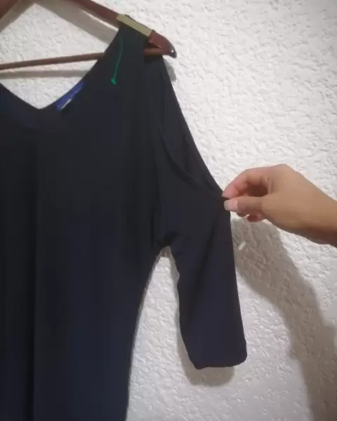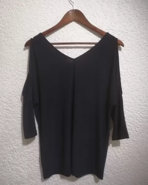 La tela es delgaditaManga 3 cuartos con hombros descubiertosTalla S, tiene aplicación de metal en tono dorado en la parte del hombroMedidasHombro 38 cmAxila 50 cmLargo desde hombro 65 cm Medidas sin estirar la prenda y de la parte del frente