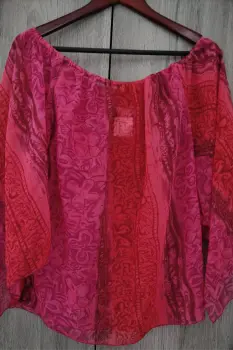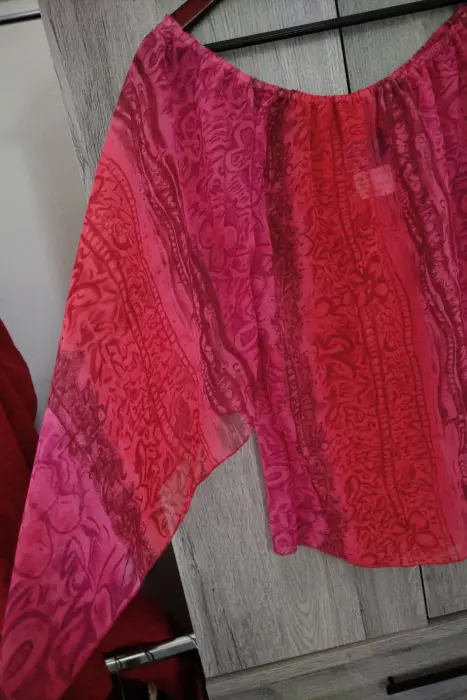 Blusa hombros descubiertos rosa-naranja. Blusa ligera, tiene manga asimétrica 3/4 en pico, la etiqueta de la blusa viene como unitalla pero queda más para tallas desde chica a la mediana.La tela no estira sin embargo de la parte de los hombros como es para hombros descubiertos tiene resorte y estira