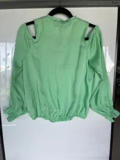 Blusa INC verde talla S. Blusa INC, nueva con etiqueta, talla S. Color verde agua, hombro descubierto y manga larga. Tela satinada. MedidasAxila a axila: 47 cmLargo: 55 cm