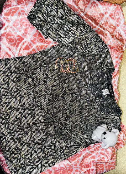 •Perteneció a la colección petite•Talla PM•Manga larga •97% Poliéster •3% Elastano •Está creada con una tonalidad verde y unos destellos dorados,creando su propio brillo y así mismo resalta cada rama