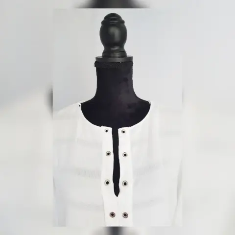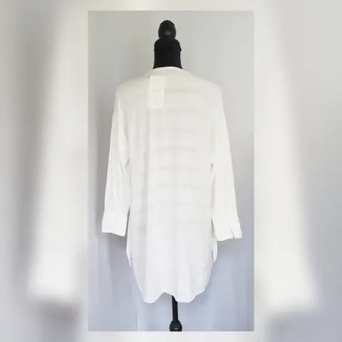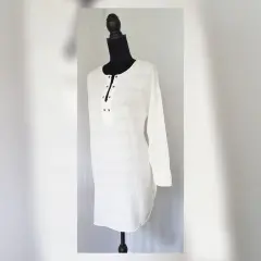 Blusa Larga Ojillos. Blusa larga color BLANCO POLAR, cuello redondo, ojillos zona frontal y manga larga terminada en puño. Talla M (Da a M/L). Dimensiones cms: 59 hombro, 55 axila, 54 cintura, 63 zona baja, 81 largo, 46 largo manga. 100% modal. Para lavado en casa.