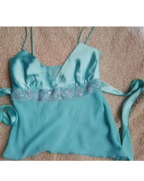 Bonita blusa lencera de gasa y satin en azul aqua, asimétrica, tiene unas marcas de pegamento por dentro en las copas pero no afecta como se ve por fuera, es muy sexy
