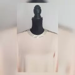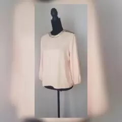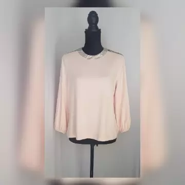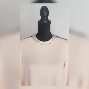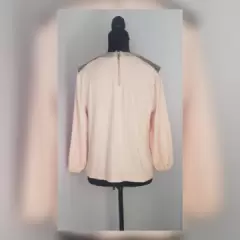 Blusa ligera color ROSA LOTO c/aplique fake fur tono PLATA en zona cuello y hombros, cuello redondo, manga 3/4 y cierre p/cremallera trasera. Talla L. Dimensiones cms: 42 hombro, 57 axila, 58 zona baja, 54 largo, 47 largo manga. 48% poliéster, 47% viscosa, 5% elastano. Para lavado en casa.