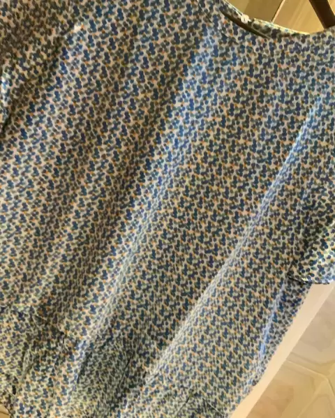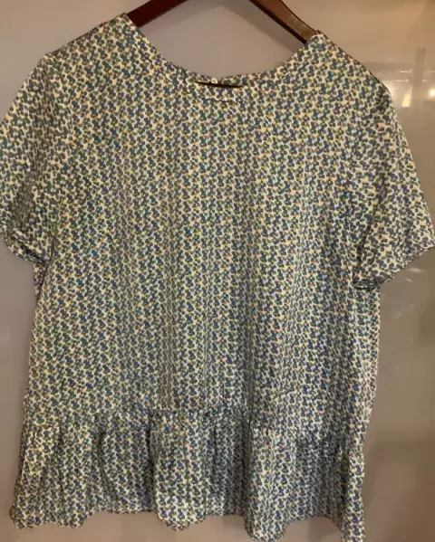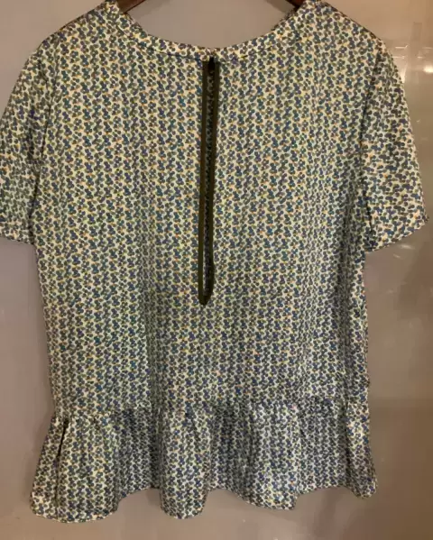 Blusa ligera con Olán. Blusa de tela sedosa, muy bonita, tiene un ligero Olán en la cintura.La espalda es descubierta, con botón.Manga corta y cuello redondo.