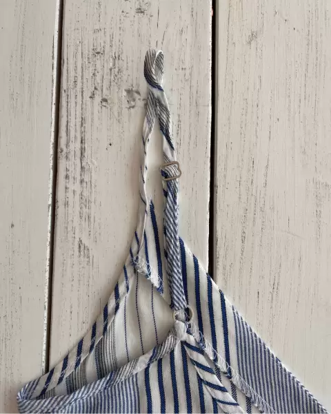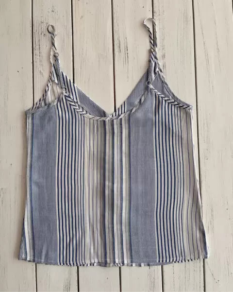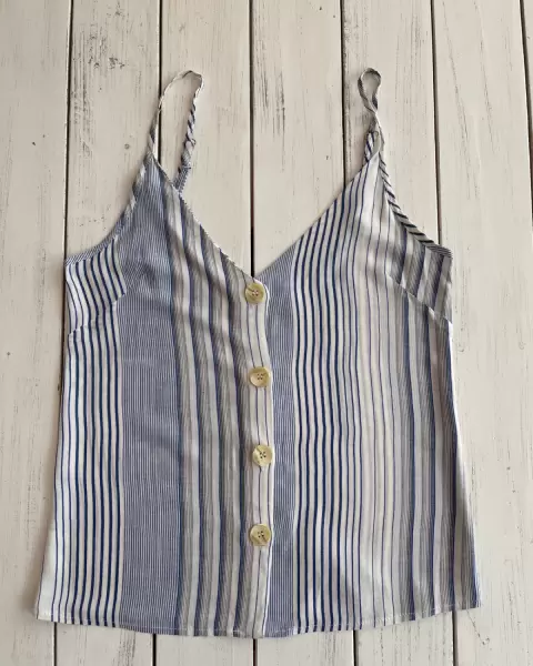 Blusa fresca muy ligera de tirantes ajustables, que se abotona al frente y no estira. La tela es suave. Base blanca con rayas azules.Talla: X1Medidas: 38.5 cm axila y 46 cm largo sin contar los tirantes.