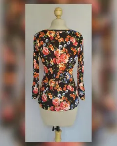 Blusa ligera c/estampado FLORAL base tono NEGRO ÉBANO y estampado floral MULTICOLOR, cuello drapeado y manga larga terminada en tira. Talla G. Dimensiones cms: 41 hombro, 52 axila, 42 cintura, 50 zona baja, 63 largo, 56 largo manga. 95% viscosa, 5% elastano. P/lavado en casa.***P/LA COMPOSICIÓN DE LA PRENDA, DA DE SI PERO NO P/SUBIR A LA SIG TALLA***