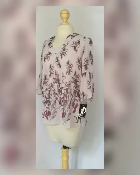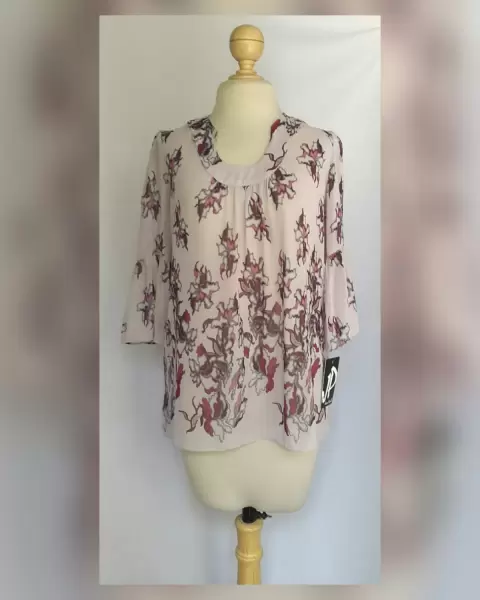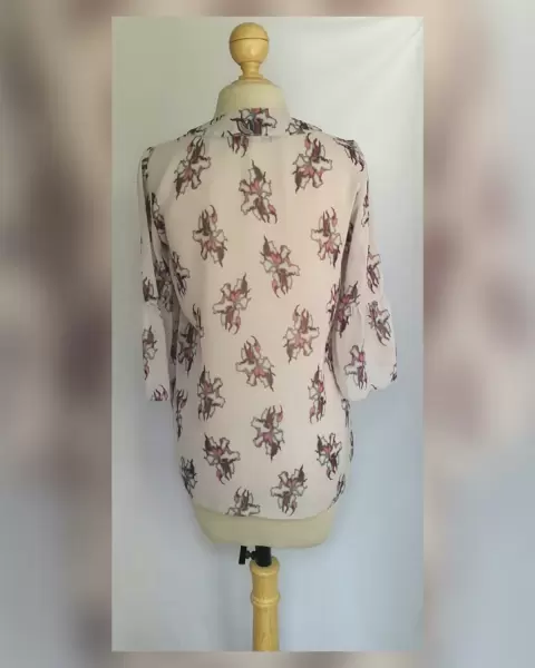 Blusa Ligera estampado Floral. Blusa ligera tipo gasa color GRIS ÁCERO con estampado floral en tonos MORADOS Y GRISES, cuello elíptico, manga 3/4 terminada en campana. Talla 34 (REDUCIDA, da mejor a 32). Dimensiones cms: 38 hombro, 50 axila, 59 zona baja, 70.5 largo, 44.5 largo manga. 100% poliéster. Para lavado en casa.