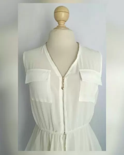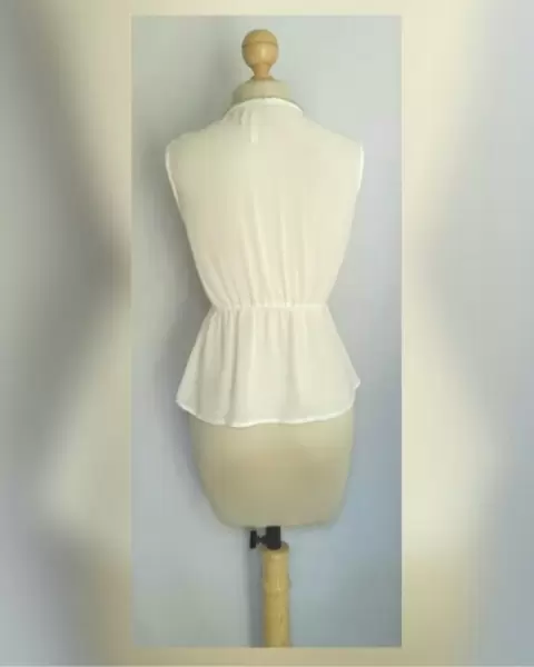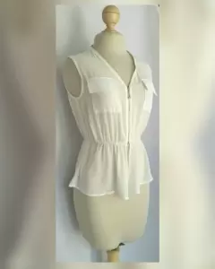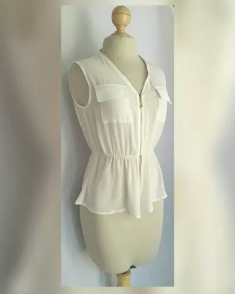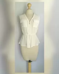 Blusa Ligera estilo Peplum. Blusa ligera estilo peplum color PERLA, cuello pico, manga sisa, 2 bolsos parche frontales c/tapeta, cierre p/cremallera y elástico en cintura p/mejor ajuste. Talla L (REDUCIDA, da a S/M). Dimensiones cms: 37 hombro, 48 axila, 34 (da hasta 49), 60 zona baja, 60 largo. 100% poliéster. P/lavado en casa.