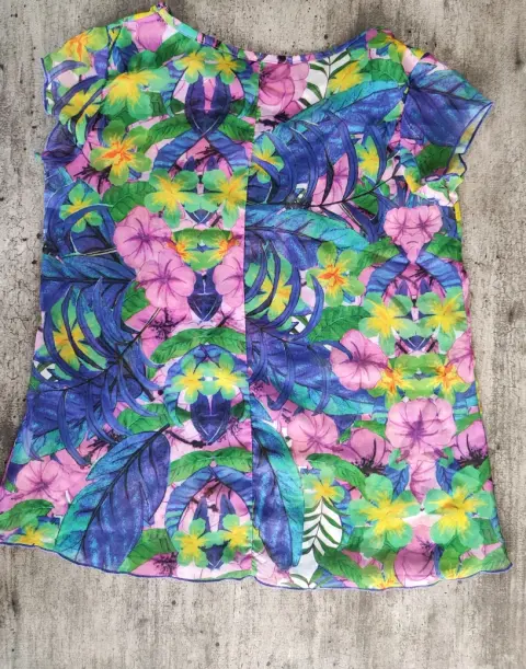 Blusausa floreada ligera y fresca, semi transparente.Talla Spuesto 1 vez, sin detallesMedidas: 43 cms axila a axila