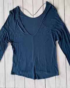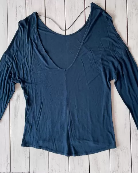 Playera holgada es un tipo de azul, manga 3/4, súper suave y cómoda, cuello redondo y escote profundo en espalda. Talla: S Medidas: 51 cm axila y 66 cm de largo desde alto del cuello.