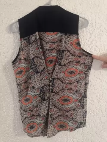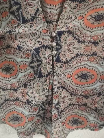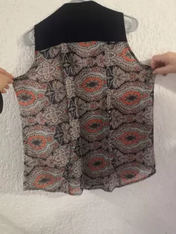 Blusa vaporosa y transparente multicolor. Talla M, marca Shasa. Cuenta con botones por el frente y tres botones en la espalda los cuales se desabotonan para hacerla más amplia. Medidas de axila a axila 50 cm de hombro a axila 24 cm, hombro a hombro 31 cm