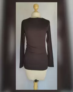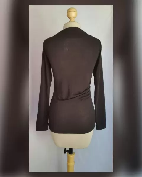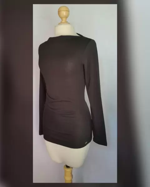 Blusa ligera stretch color NEGRO ÉBANO, cuello barco, costado drapeado y manga larga. Talla G. Dimensiones cms: 40 hombro, 44 axila, 37 cintura, 44 zona baja, 76 largo, 65 largo manga. 50% algodón, 50% poliéster. P/lavado en casa.***POR LA COMPOSICIÓN DE LA PRENDA, DA DE SI APROX 10 CMS, PERO NO PARA SUBIR A LA SIG TALLA***