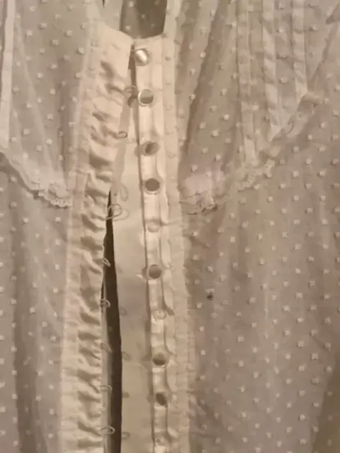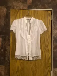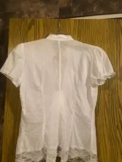 Linda blusa blanca con detalles que la hacen lucir , botones y detalles de encaje . Medidas axila a axila 43, cintura 34 y largo 55. La tela no estira .Se uso solo una vez , tiene detalle se jalo de la parte de enfrente se ve en la foto
