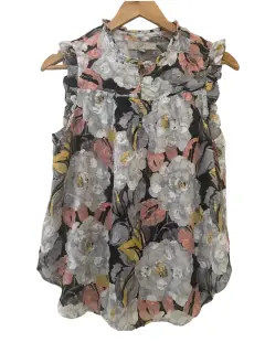 Blusa Loft floral. Hermosa blusa con textura, estampado floral en tonos gris y pastel. Con volados en mangas, botones dorados al frente. Con forro no se transparenta
