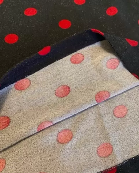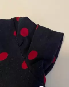 Blusa azul marino con lunares rojos, mangas abullonadas, acinturada.