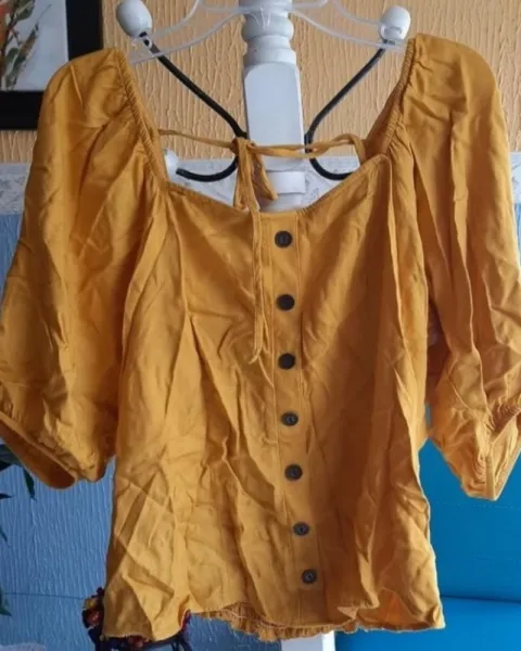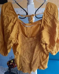 Blusa cuello cuadrado, con escote en la espalda y cordón, manga 3/4, color amarillo mostaza. Sin detalles.