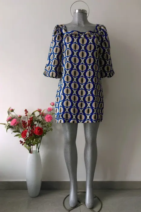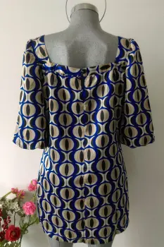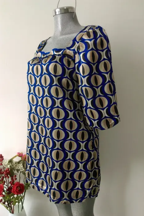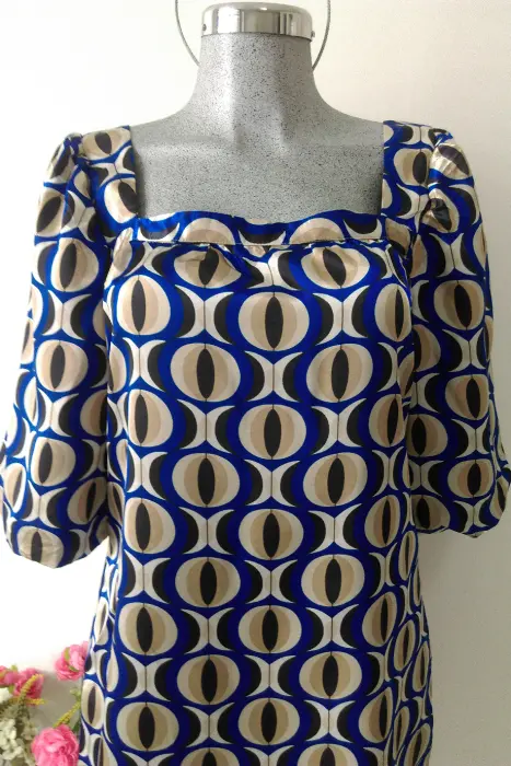 Hermosa blusa en tonos azul rey , negro y blanco. Con diseño de escote recto y mangas abullonadas con forro suaveTela 100% poliéster suave con terminado satinadoMarca She´s CoolTalla L. GrandePecho 106 cmAxila/axila 53 cmCintura 104 cmLargo 80 cmMangas: largo 40 cm y ancho 38 cm