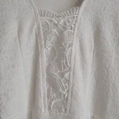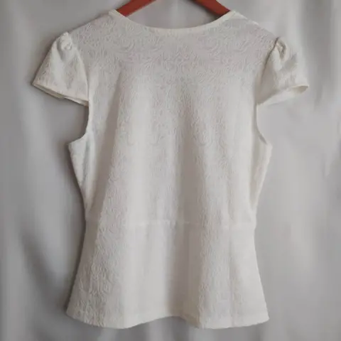 Blusa manga corta. Blusa color crudo, con relieve y bonito detalle al frente. Estira un poco. Sin detalles. Como nueva. Talla L. Medidas en la última foto
