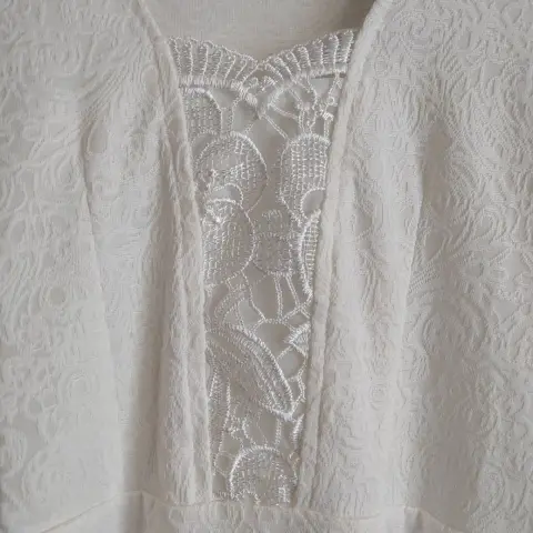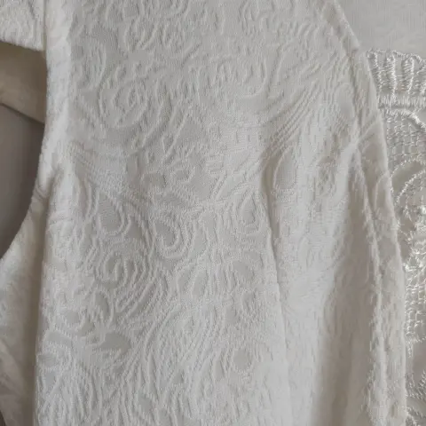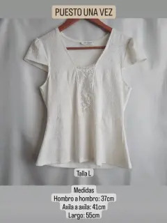 Blusa color crudo, con relieve y bonito detalle al frente. Estira un poco. Sin detalles. Como nueva. Talla L. Medidas en la última foto