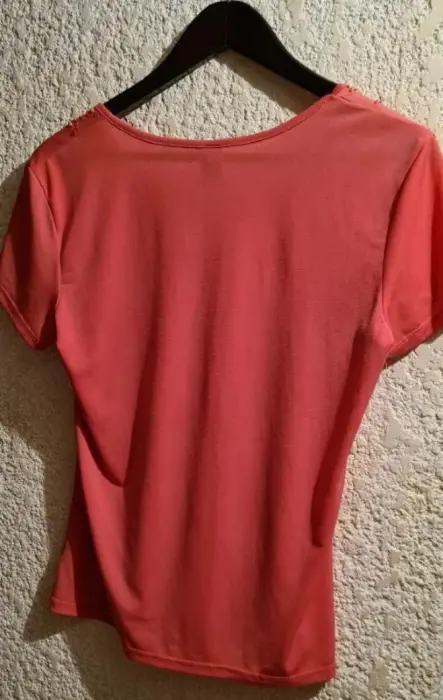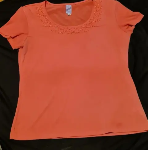 BLUSA MANGA CORTA, COLOR CORAL,TALLA 34,TIENE PERLAS Y CHAQUIRA EN EL CUELLO,MARCA DJ KRMA,EXCELENTE ESTADO,DE HOMBRO A HOMBRO 45 CM,DE AXILA A AXILA 52 CM, LARGO 59 CM