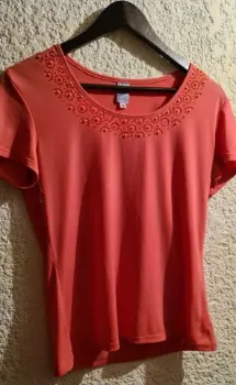BLUSA MANGA CORTA TALLA 34. BLUSA MANGA CORTA, COLOR CORAL,TALLA 34,TIENE PERLAS Y CHAQUIRA EN EL CUELLO,MARCA DJ KRMA,EXCELENTE ESTADO,DE HOMBRO A HOMBRO 45 CM,DE AXILA A AXILA 52 CM, LARGO 59 CM