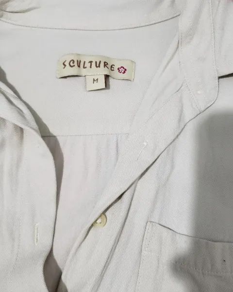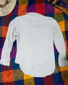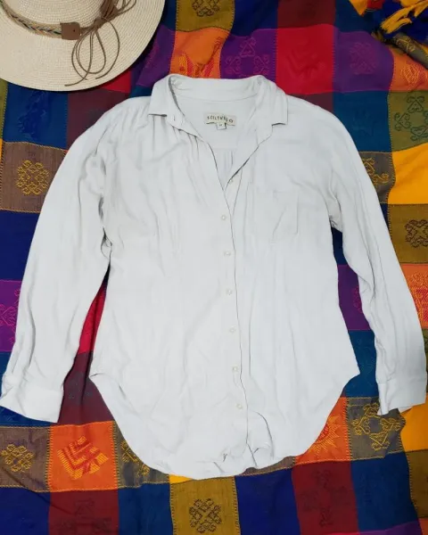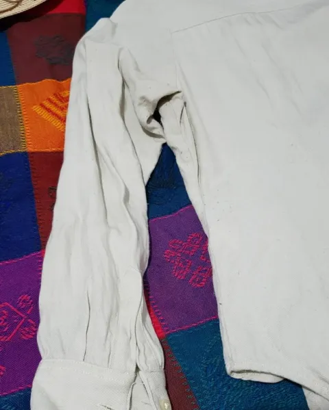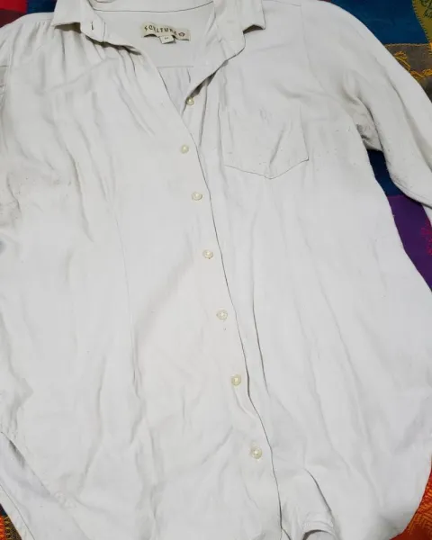 Bonita blusa manga larga de botones color blanco hueso, la tela es 100% rayón, el corte queda muy bonito, largo de adelante y atrás. No estira. El único detalle es que tiene poca pelusa y se puede quitar. Mis medidas como referencia son:- pecho 100 cm- hombre 42 cm- cintura 79 cm