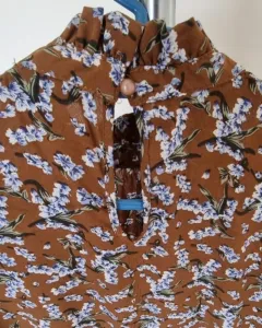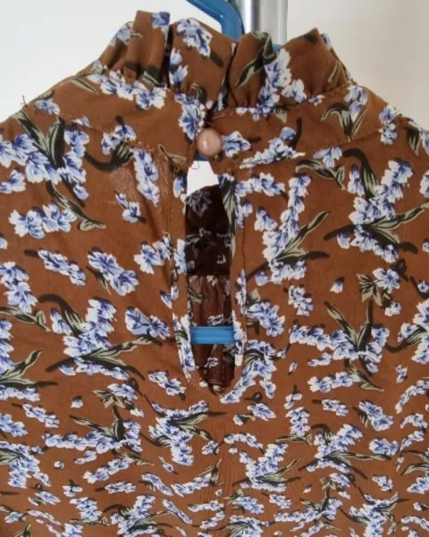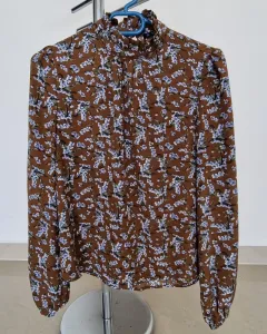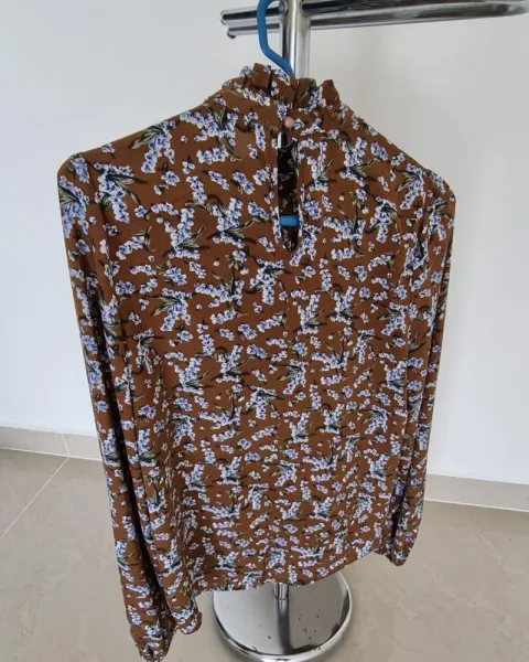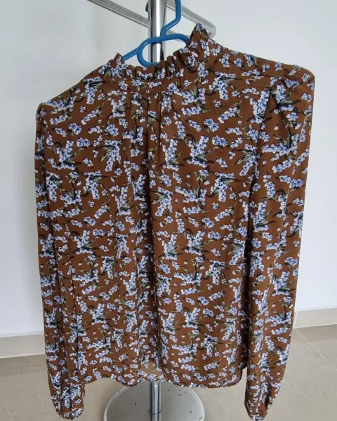 Blusa con cuello alto y olanes. Manga larga no es ajustada. Formal