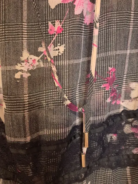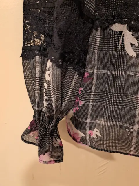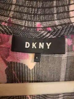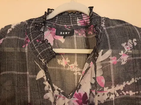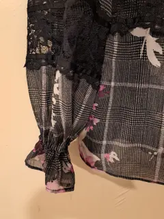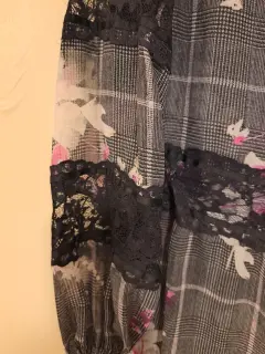Blusa Manga larga de tela delgada con franjas de encaje negro, en color de cuadros negros con beige y con flores blancas con grises y fiushasSe amarra al frente.ancho 55cmLargo 71 cmMarca DKNY