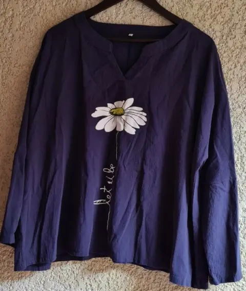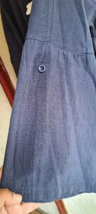 CAMISA MANGA 3/4,COLOR AZUL MARINO, TARE ELEVADORES EN LOS COSTADOS, ESTAMPADO, MARCA SHEIN, DETALLE MANCHA (CASI NO SE VE )MANGA IZQUIERDA 4TA FOTO, DE AXILA A AXILA 73 CM LARGO 60 CM, LIGERO ESCOTE EN "V"